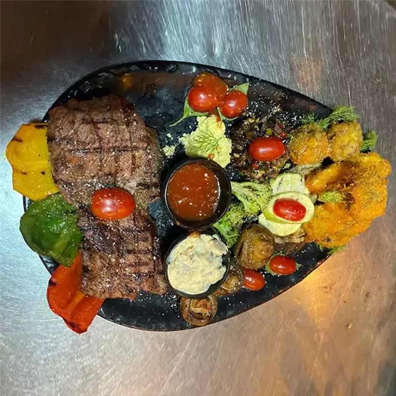 گوشت گوساله مزه دار شده، سینه مزه دار شده مرغ ، قارچ ، گوجه گیلاسی و ....